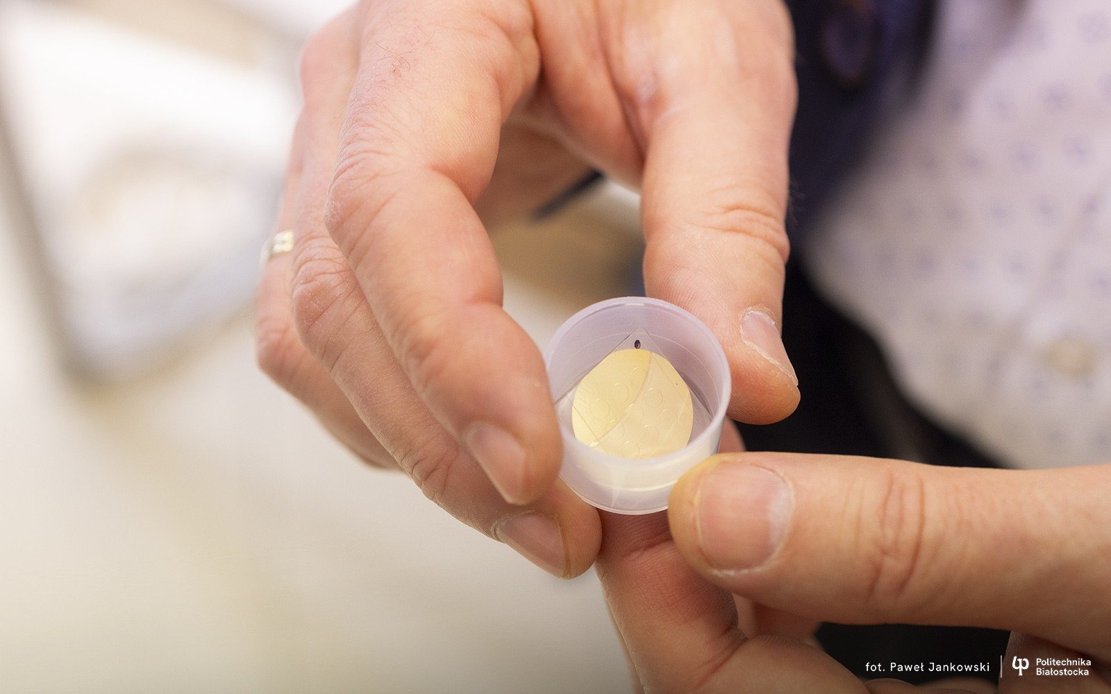 – Typowe chipy wykorzystane w tego typu biosensorach wykonywane są generalnie w postaci szklanych płytek z warstewką złota z powodu jego unikalnych właściwości plazmonicznych, jak i odporności chemicznej – wyjaśnia dr. hab. inż. Piotr Mrozek, prof. PB, kierownik Zakładu Biomechatroniki na Wydziale Mechanicznym Politechniki Białostockiej. – My wykorzystaliśmy srebro, które gwarantuje nam większą czułość chipu. Natomiast warstwa srebra pokryta jest również cienką warstwą złota, dzięki czemu uzyskujemy właściwości użytkowe zbliżone do typowych chipów, czyli powierzchnia takiego sensora jest odporna chemicznie. Niemniej jednak taka kanapka złożona z tych dwóch metali daje nam w efekcie znacznie większą czułość sensora do takich typowych oznaczeń. Do warstw tej kanapki dołożyliśmy jeszcze warstewki związane z separacją pól pomiarowych. Wykorzystaliśmy maski polimerowe naszego pomysłu, które są związane z powierzchnią złota, które jest górną warstwą biosensora. Wielowarstwowa struktura metaliczno-polimerowa, można powiedzieć w skrócie, jest przedmiotem naszego patentu.