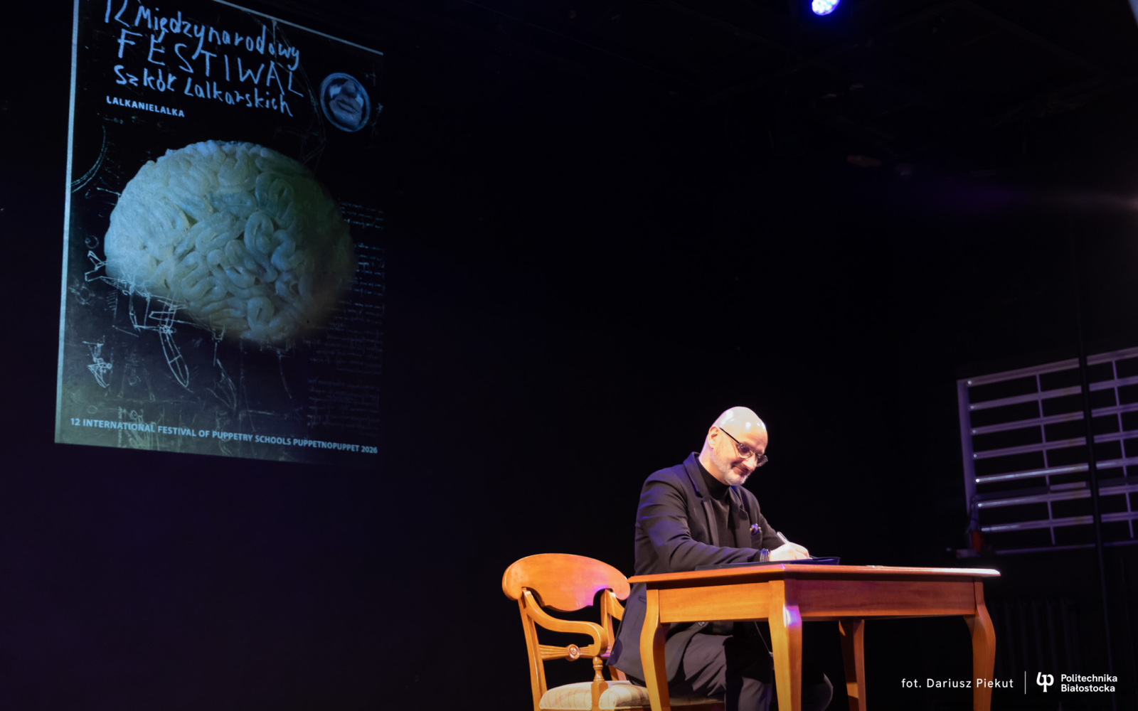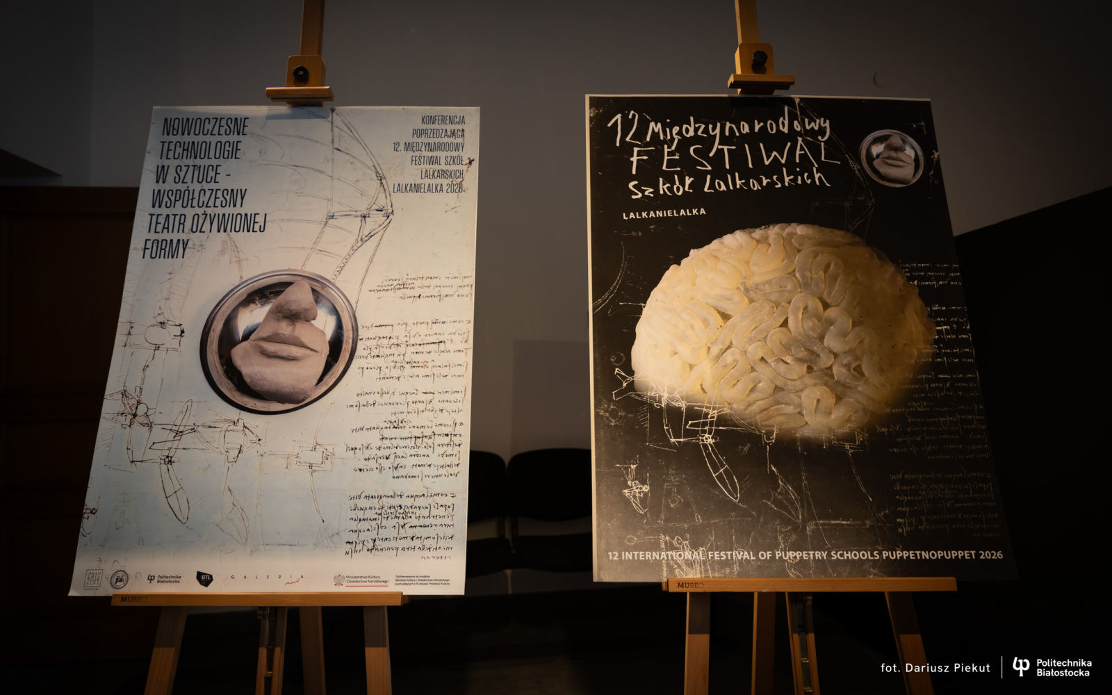– Do tej pory starałem się, aby hasło „Lalka, nie lalka” znajdowało odzwierciedlenie w grafice, w której przedmioty ożywają tak, jak w rękach aktorów – wspomina prof. Dworakowski. – Bohaterami były m.in. nożyce do strzyżenia owiec, sekator, spinacze czy piła do drewna. Tegoroczny plakat odnosi się do współczesnych technologii i świata, w którym funkcjonujemy. Jak zwykle zrobiłem krok wstecz – i sięgnąłem do rysunków Leonarda da Vinci, które stanowią tło projektu. Mam nadzieję, że w dalszej identyfikacji wizualnej będą jeszcze bardziej widoczne, ukazując go jako mistrza rysunku, architekta, konstruktora i wizjonera. Znamy Leonarda głównie jako autora „Mony Lizy”, jednak jego dorobek intelektualny i koncepcyjny znacząco wyprzedzał epokę. Wiele z jego projektów udało się współcześnie zrealizować – i działają. Dlatego uznałem, że motywem przewodnim tegorocznej edycji powinny być rozum i myślenie. Na tle rysunków Leonarda pojawia się więc mózg, wykonany przez absolwentkę kierunku technologia teatralna. Mam nadzieję, że stanie się on symbolem nowej energii festiwalu i zachęci do śledzenia zarówno identyfikacji wizualnej, jak i wydarzeń scenicznych.