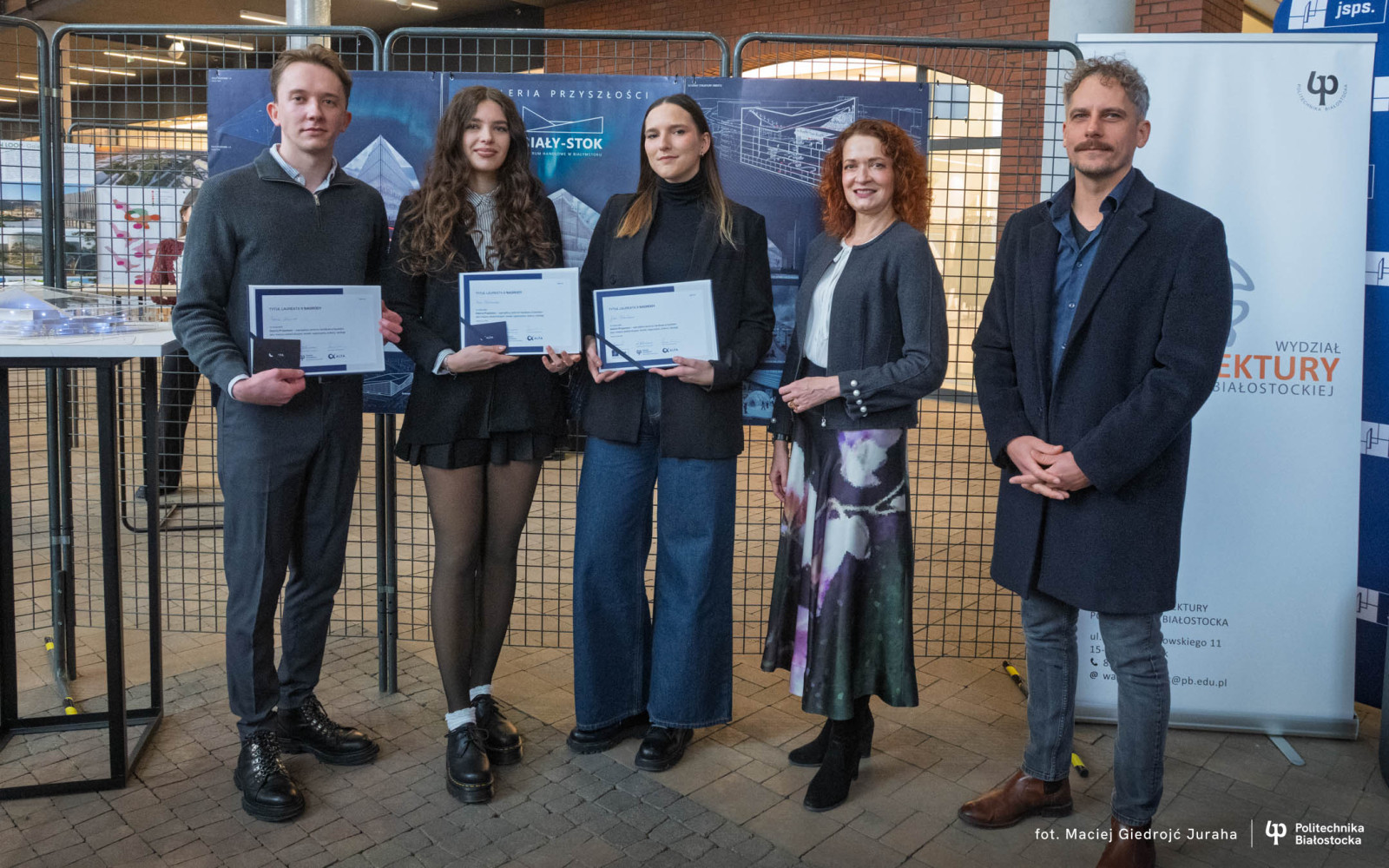 Zespół studentów Wydziału Architektury Politechniki Białostockiej w składzie Julia Michałowska, Ewa Niewiarowska i Tomasz Łaszczuk zdobył w konkursie Galeria Przyszłości drugie miejsce i bony na zakupy do Alfa Centrum w łącznej wysokości 2 000 zł.