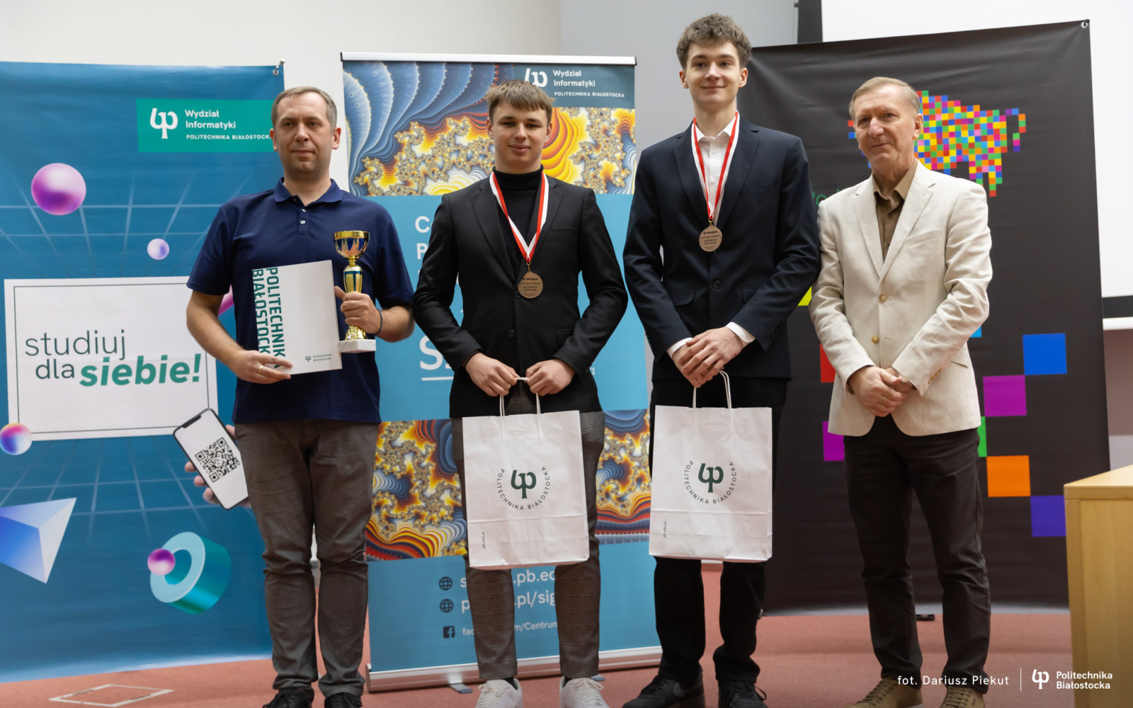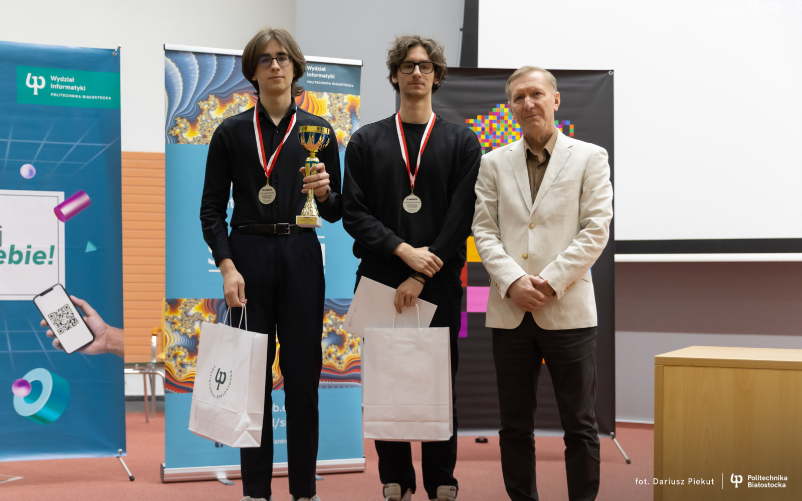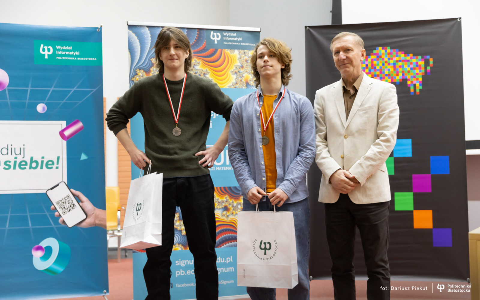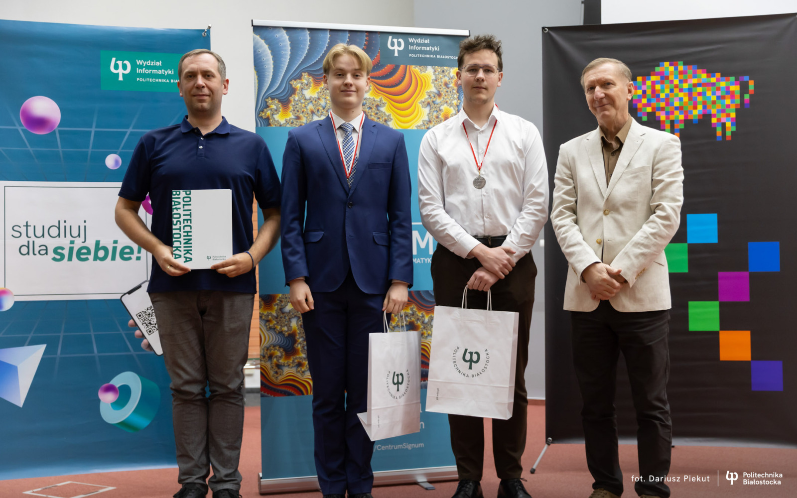 27 kwietnia 2026 r. gratulacje zwycięzcom złożyli: dr hab. inż. Ireneusz Mrozek, prof. PB (Prodziekan Wydziału Informatyki) oraz dr inż. Rajmund Stasiewicz (pomysłodawca konkursu i kierownik Centrum „Signum”).