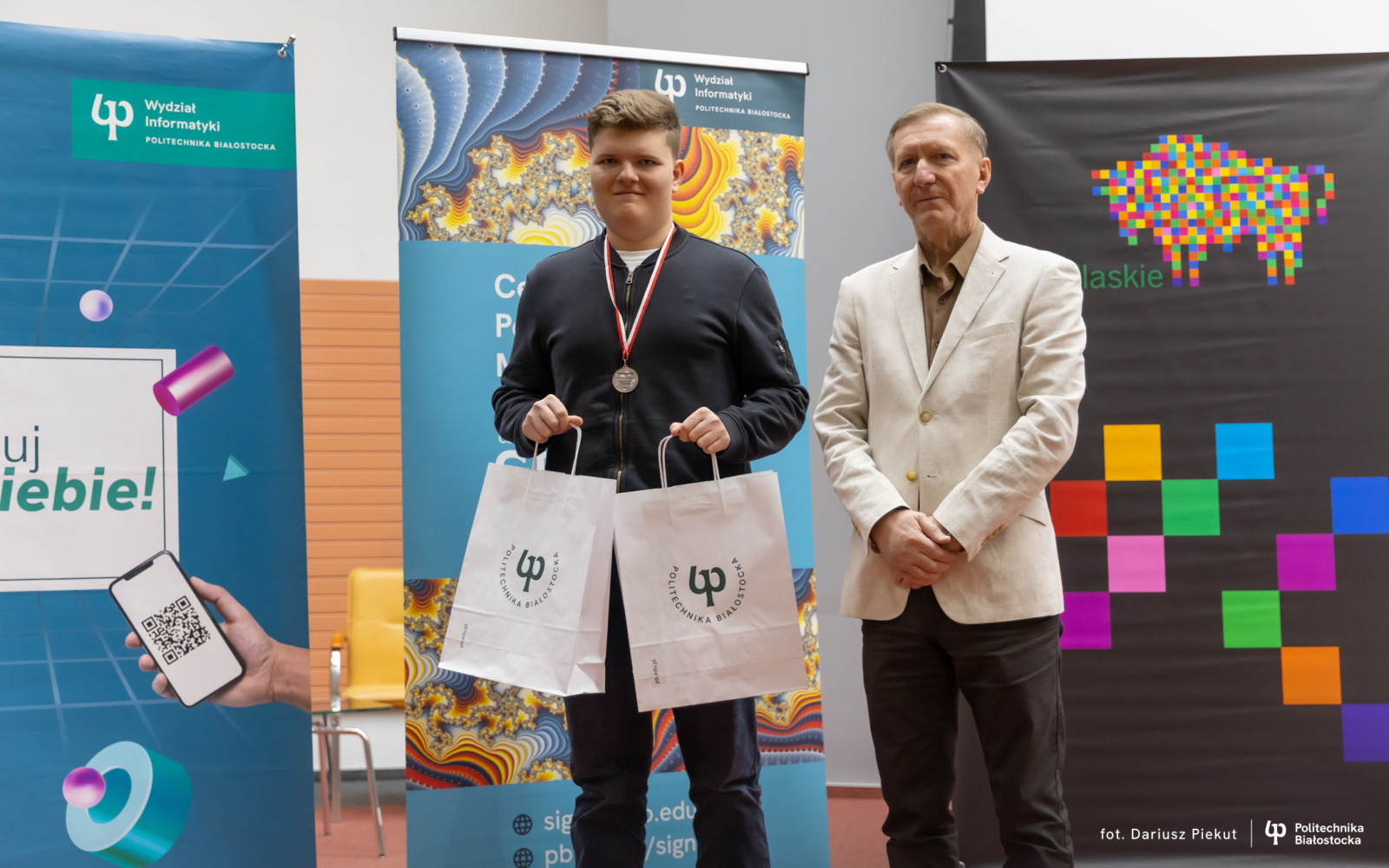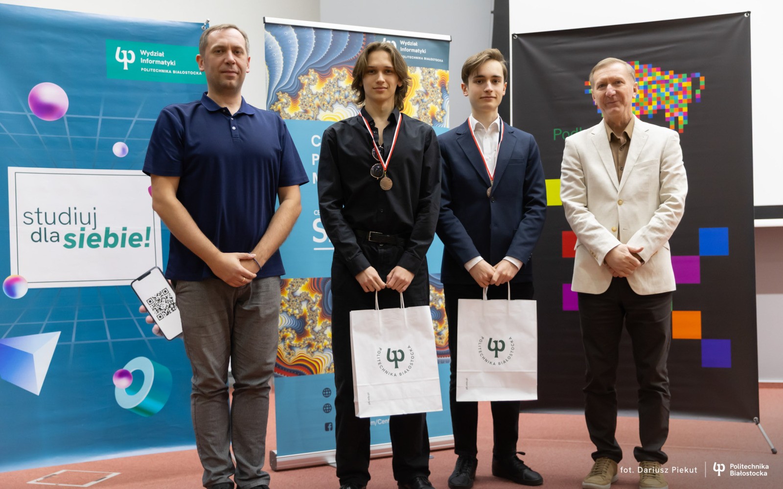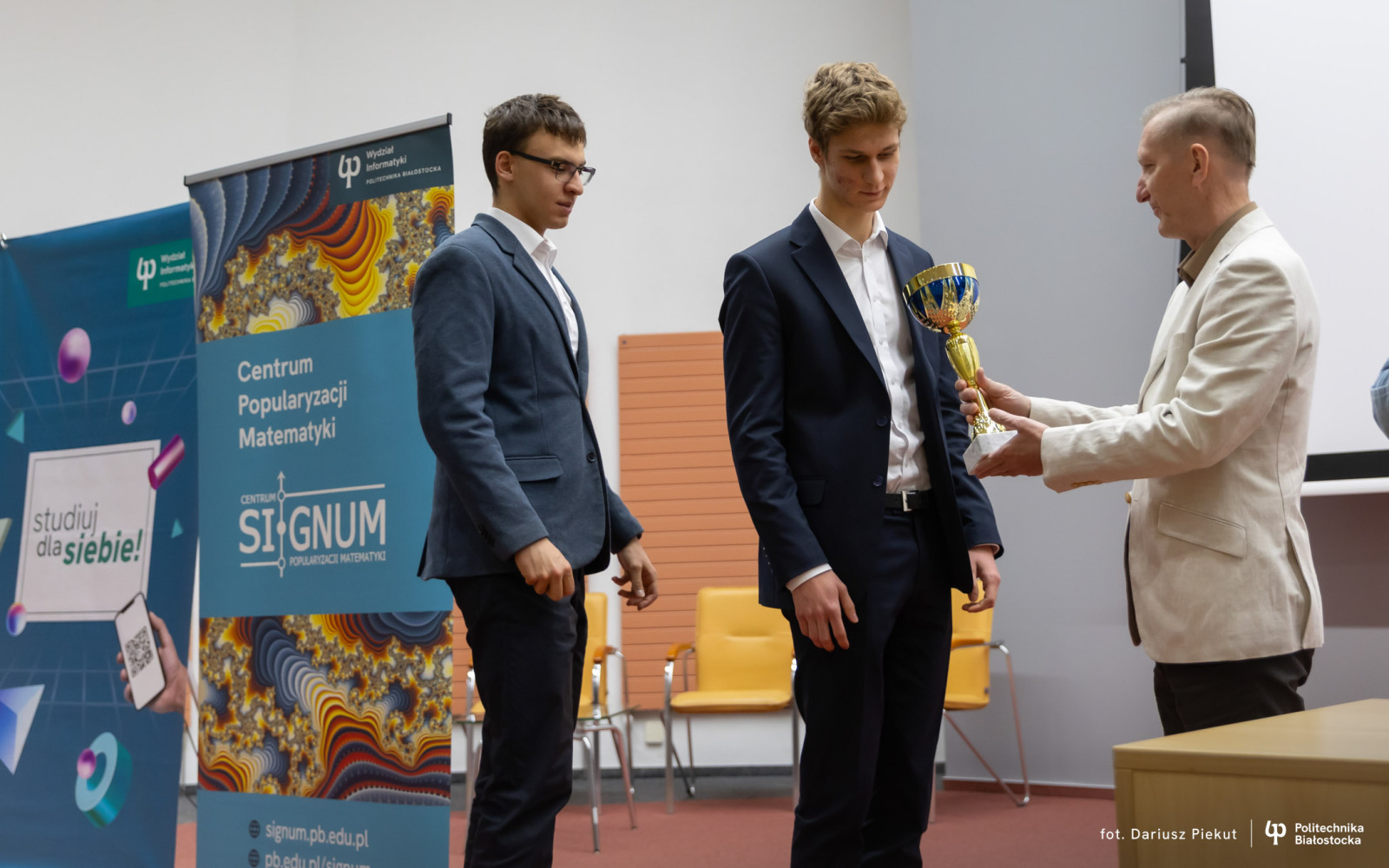 27 kwietnia 2026 r. gratulacje zwycięzcom złożyli: dr hab. inż. Ireneusz Mrozek, prof. PB (Prodziekan Wydziału Informatyki) oraz dr inż. Rajmund Stasiewicz (pomysłodawca konkursu i kierownik Centrum „Signum”).