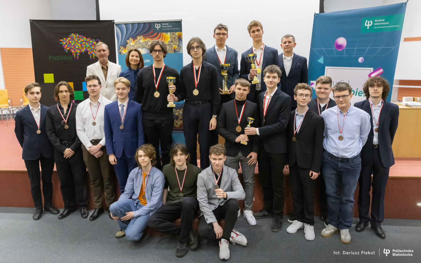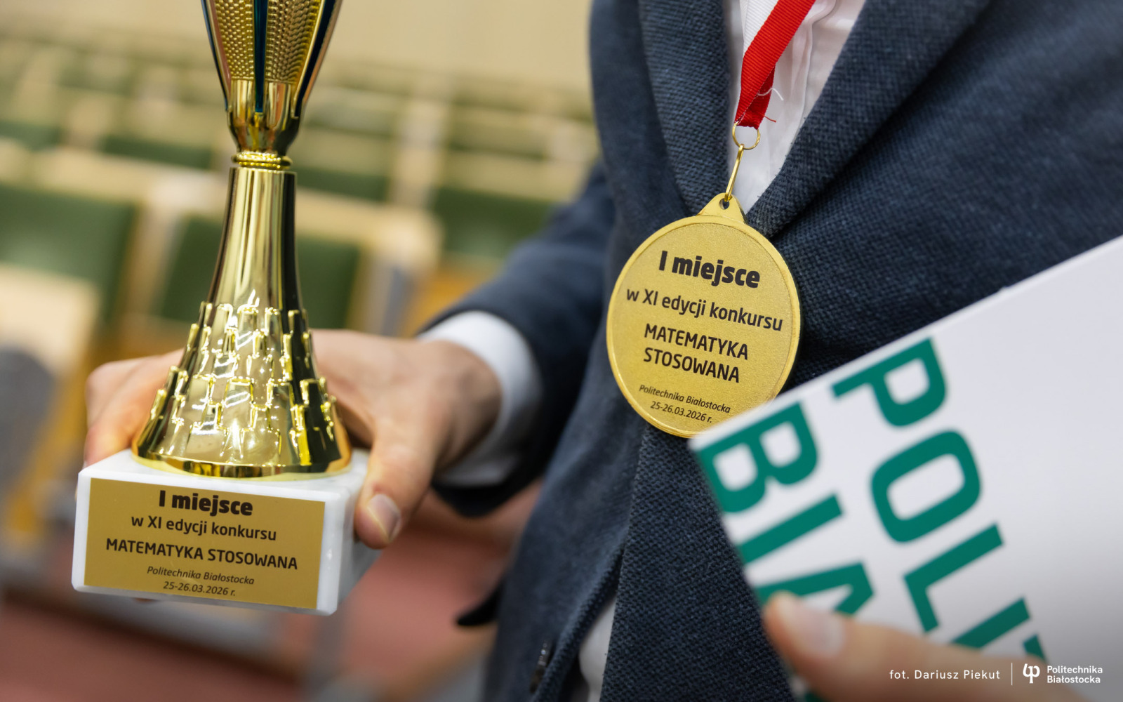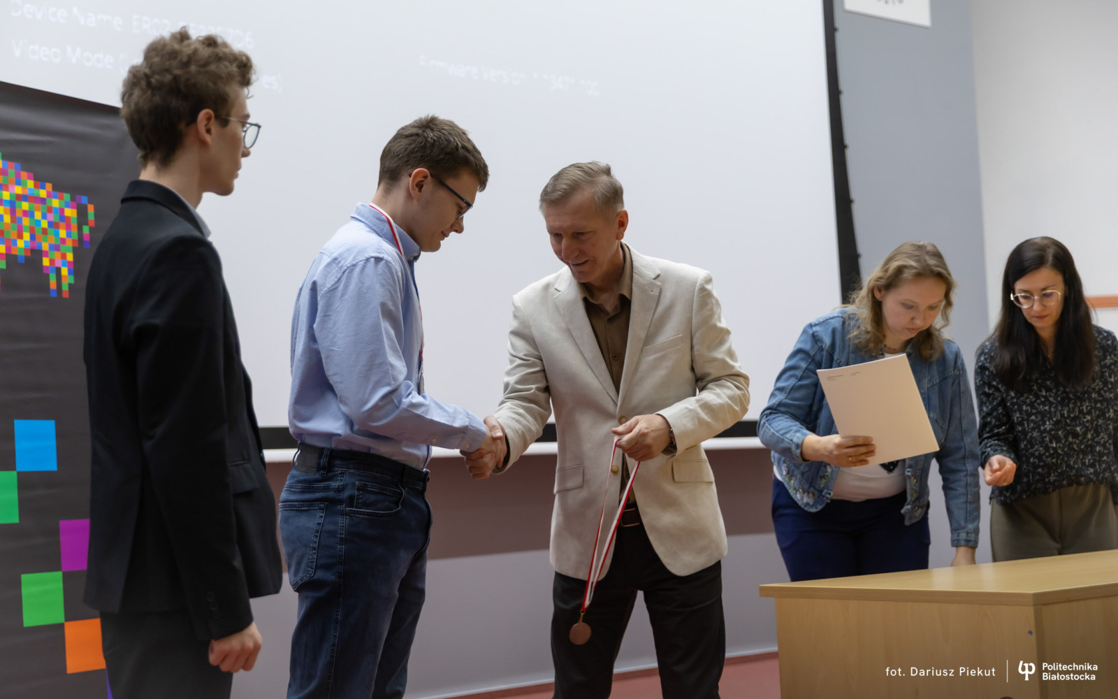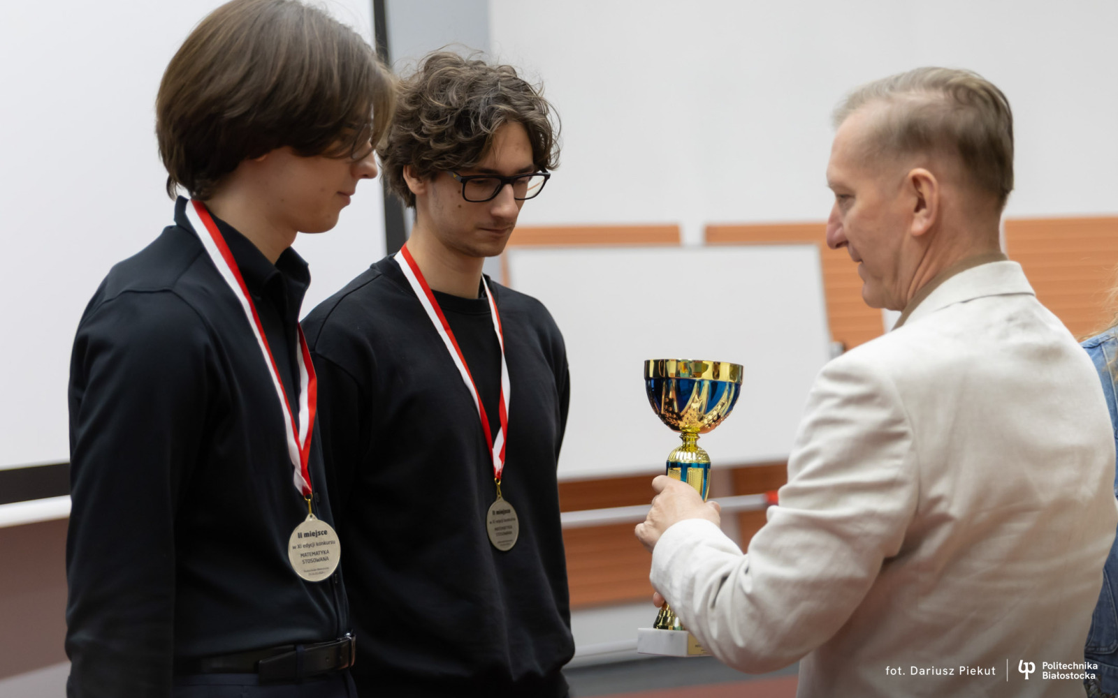 27 kwietnia 2026 r. gratulacje zwycięzcom złożyli: dr hab. inż. Ireneusz Mrozek, prof. PB (Prodziekan Wydziału Informatyki) oraz dr inż. Rajmund Stasiewicz (pomysłodawca konkursu i kierownik Centrum „Signum”).