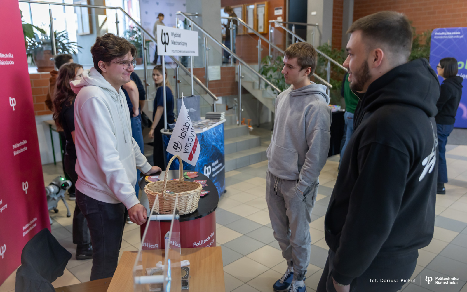 W Maturanku – Poranku Maturzysty 2025 maturzyści mogli wziąć udział 14 listopada w godz. 9.00-13.00 na Wydziale Elektrycznym Politechniki Białostockiej. Na stoisku informacyjnym Uczelni obecni byli przedstawiciele Centrum Spraw Studenckich, Dydaktyki i Rekrutacji, którzy przybliżali młodzieży ofertę studiów i zasady rekrutacji Politechniki Białostockiej. Maturzyści mogli też porozmawiać ze studentami z kół naukowych Politechniki Białostockiej.