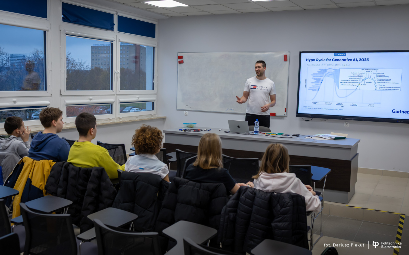 – Na naszych zajęciach przedstawiamy świat VR i przybliżamy technologię poprzez zabawę – mówi Jakub Zawadzki, należący do koła naukowego VectoR, student 1. roku na kierunku informatyka, który współprowadził zajęcia „Dotknij Przyszłości – VR w Edukacji i Rozrywce” na Wydziale Informatyk Politechniki Białostockiej – Młodzi uczestnicy mogą u nas pobawić się wirtualną rzeczywistością i dowiedzieć się, jak wygląda tworzenie gier od strony technicznej.
