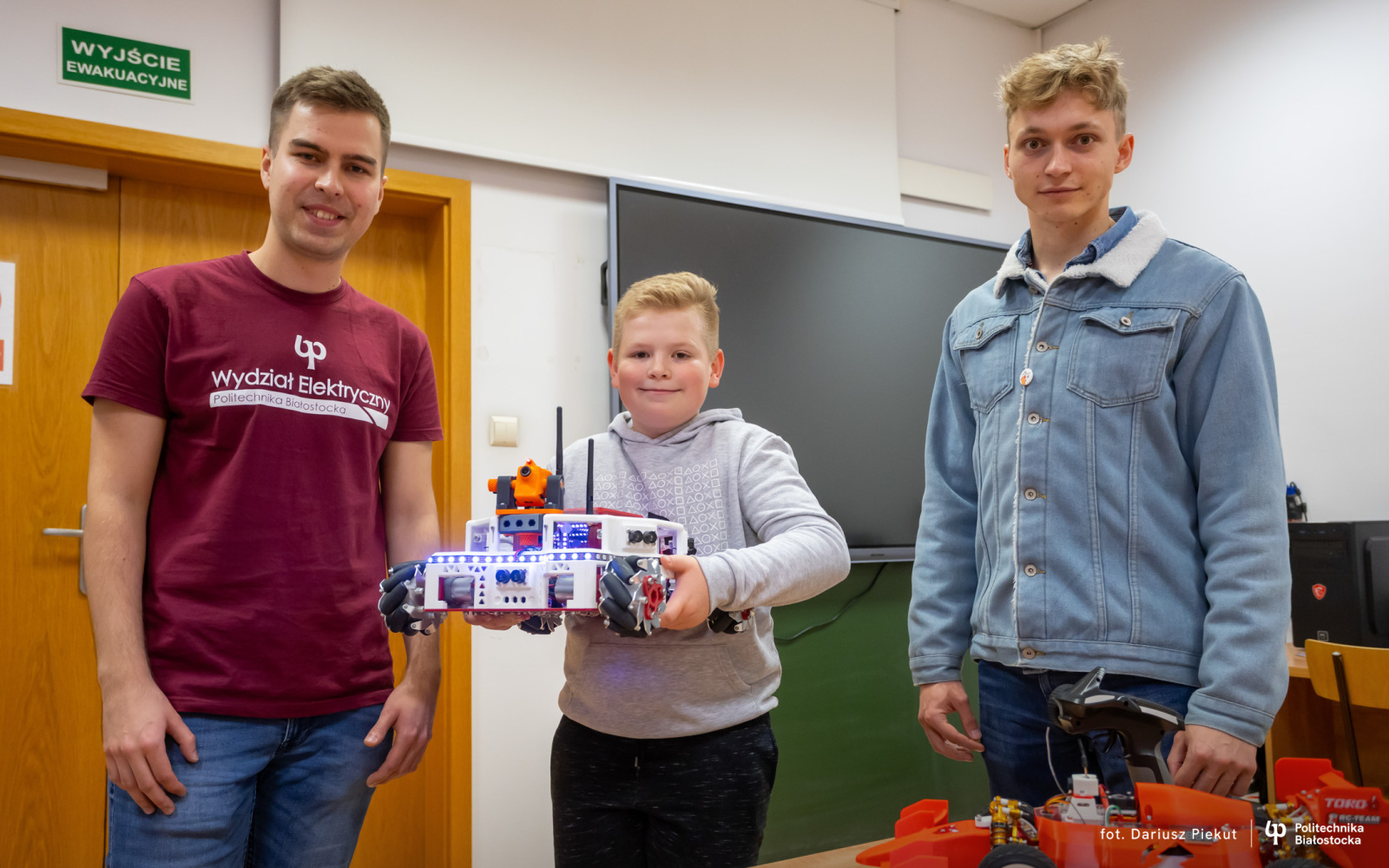 – Przyszedłem tutaj, aby zobaczyć pojazdy robotyczne na zajęciach z elektroniki i mechanizacji – mówi Błażej Grygoruk, lat 10 lat, biorący udział w warsztatach „Pojazdy robotyczne zdalnie sterowane” na Wydziale Elektrycznym Politechniki Białostockiej – Chciałbym skonstruować zdalny samochodzik. Bardzo dużo buduję z Lego.
