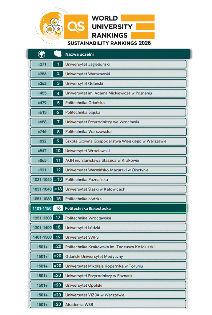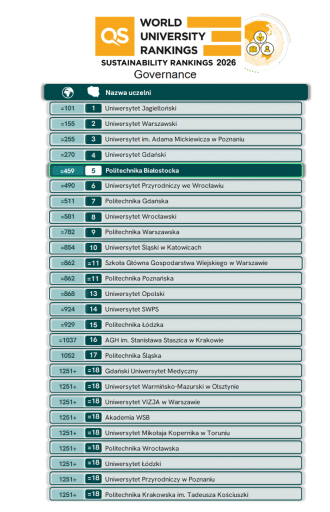 Politechnika Białostocka na 5. miejscu w Polsce w kategorii Governance rankingu QS World University Rankings: Sustainability 2026. Najnowsza edycja prestiżowego zestawienia potwierdza silną pozycję białostockiej uczelni technicznej w obszarze odpowiedzialnego zarządzania.