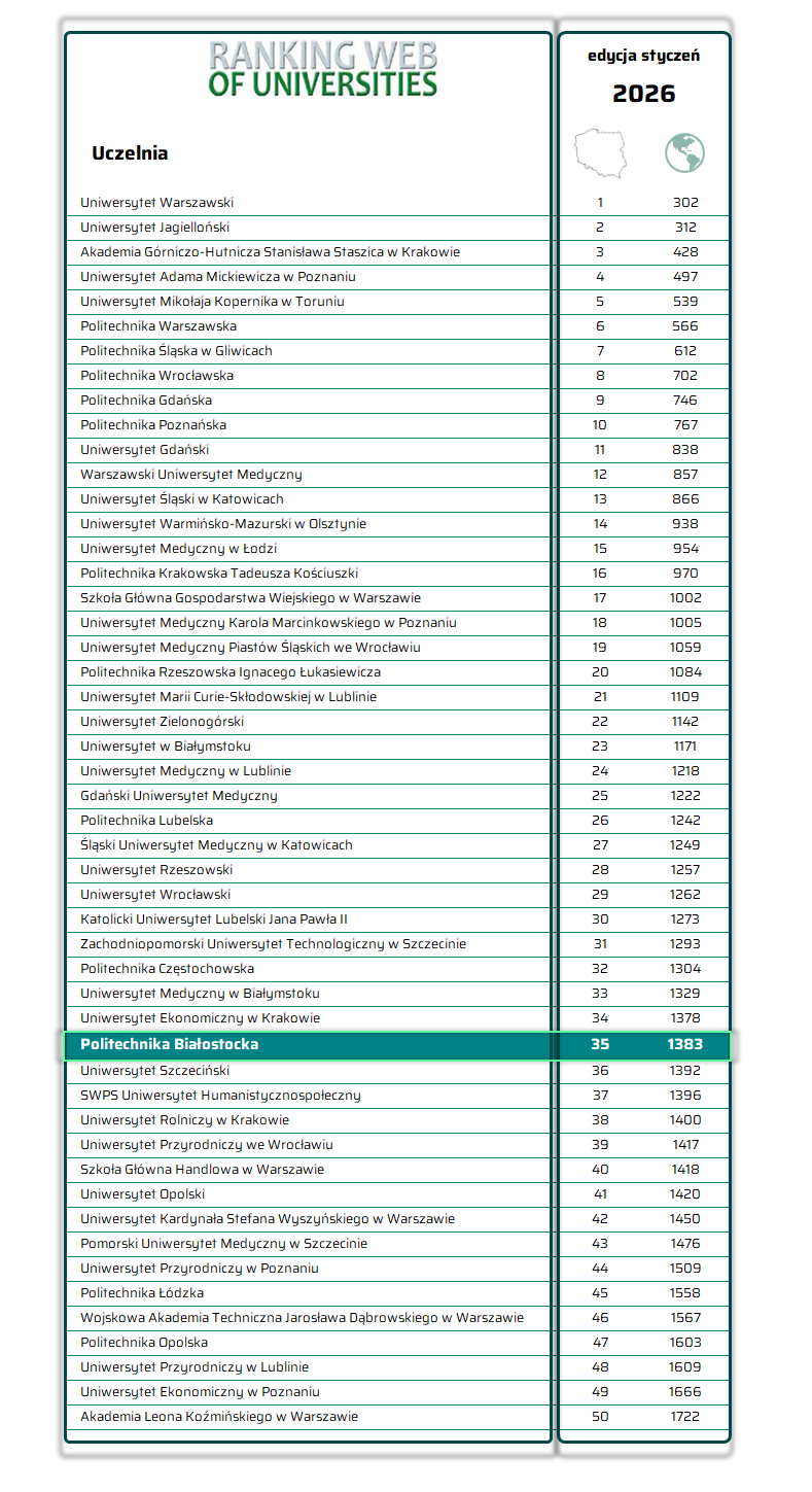 Mamy się czym chwalić! W najnowszej odsłonie Webometrics Global Web Rankings for Universities ze stycznia 2026 roku Politechnika Białostocka awansowała o 606 pozycji w światowym zestawieniu, w porównaniu z edycją ze stycznia 2025 roku. To znaczący wynik, który potwierdza rosnącą pozycję naszej uczelni na arenie międzynarodowej.