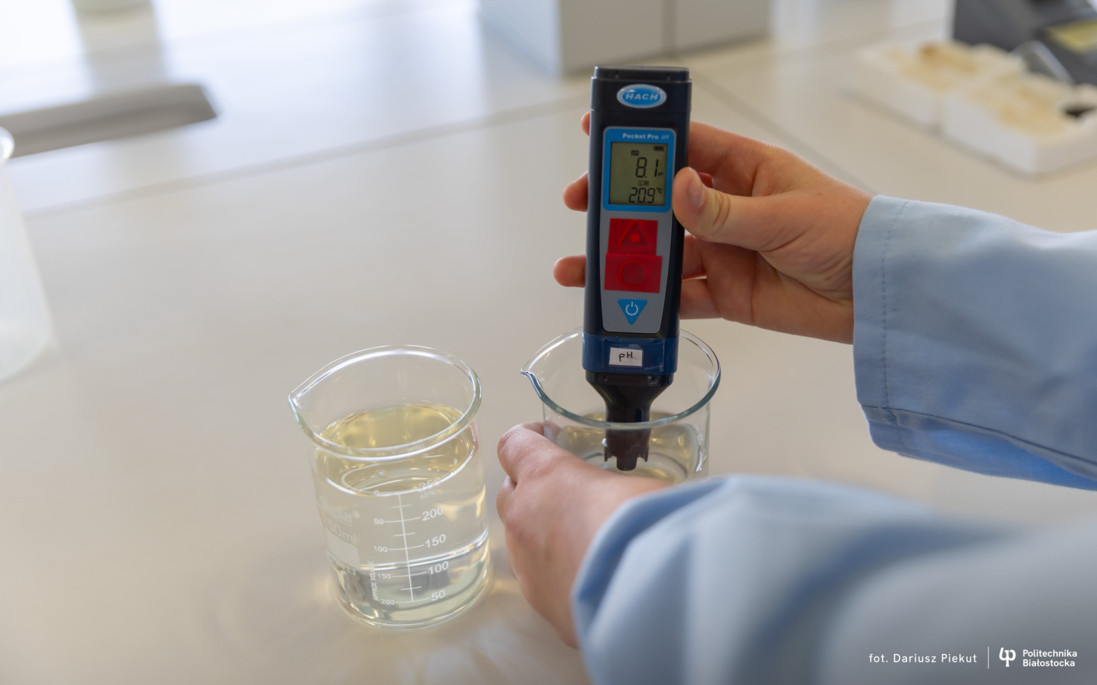 Uczniowie wcielają się w rolę młodych analityków laboratoryjnych i poznają podstawowe metody oceny jakości wody. W laboratorium wykonają pomiary wybranych parametrów fizykochemicznych, takich jak pH, przewodność elektrolityczna właściwa oraz stężenie tlenu rozpuszczonego, które dostarczają informacje o właściwościach wody i jej stanie jakościowym. Następnie, pod okiem prowadzącego, przeprowadzają oznaczanie zawartości wapnia metodą miareczkową oraz oznaczenie żelaza, poznając wybrane techniki analityczne stosowane w chemii i inżynierii środowiska. Zajęcia mają charakter praktyczny i pokazują, jak nauka laboratoryjna pomaga oceniać jakość wody w środowisku oraz w życiu codziennym. Uczniowie dowiadują się również, dlaczego badane parametry są ważne dla zdrowia człowieka, ekosystemów oraz procesów uzdatniania wody.