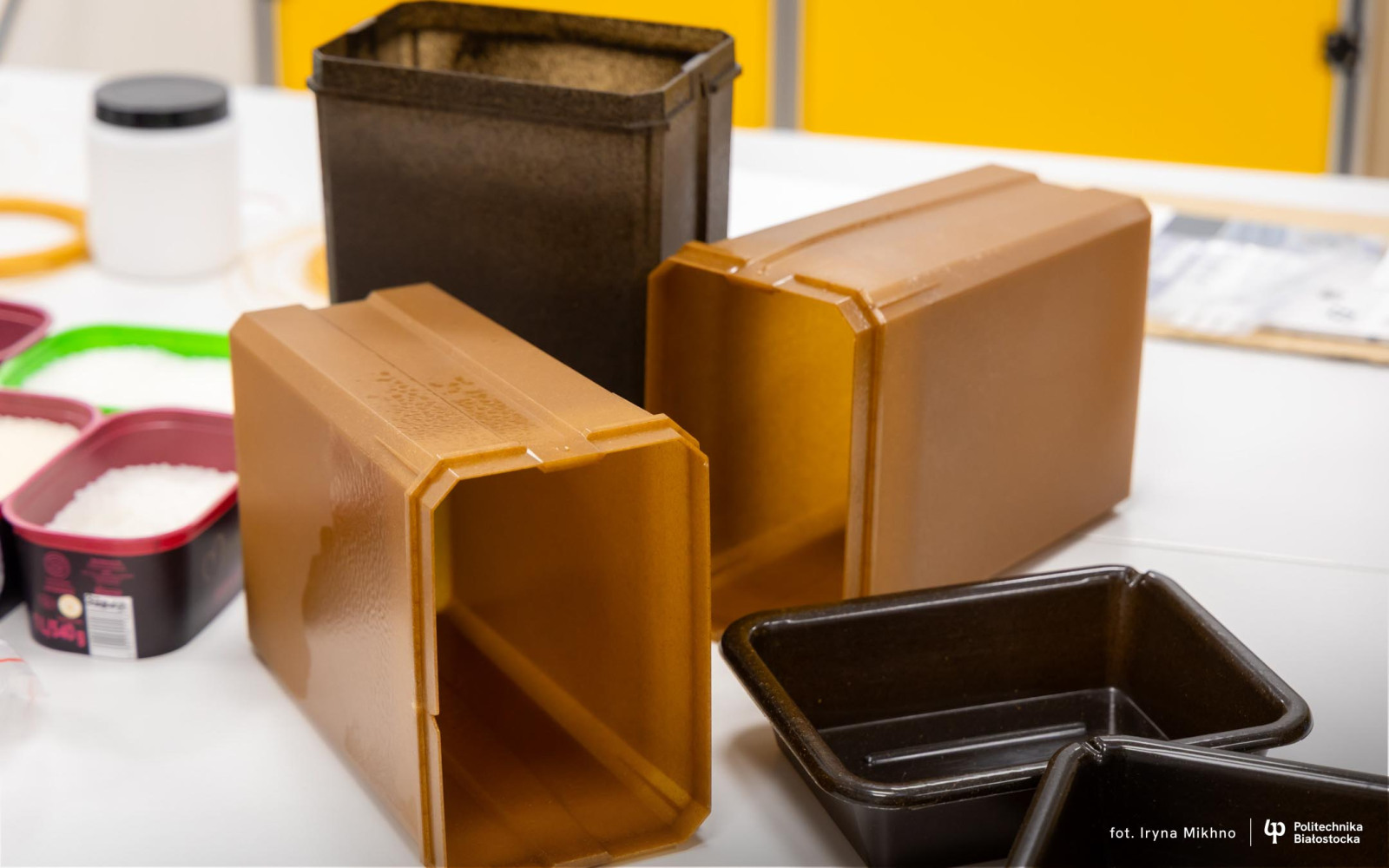 Politechnika Białostocka przygotowała dwie partie wiader – jedną wykorzystującą łupiny pestek słonecznika. Charakterystyczny naturalny kolor łuski nadaje wyrobom ciemno brązowy kolor. Te jaśniejsze to efekt połączenia polilaktydu z przemielonym tatarakiem.